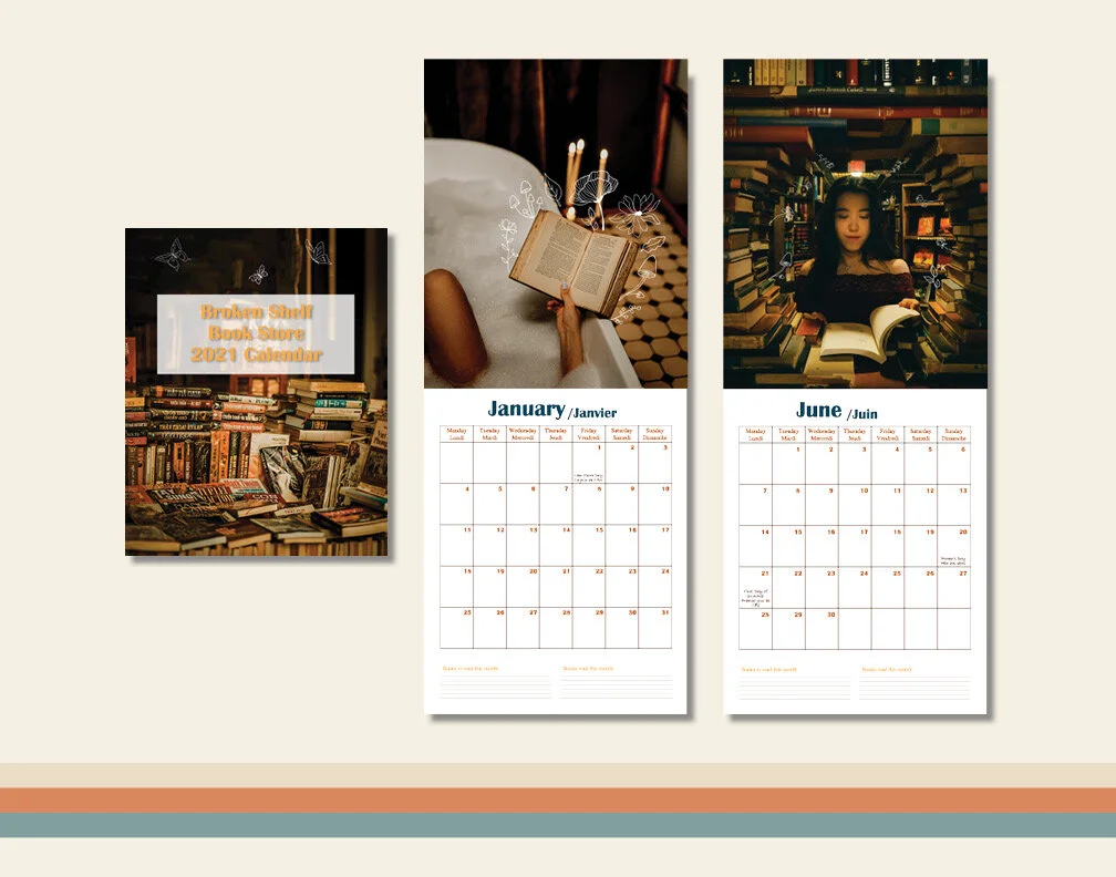 We were to create an 8”X10” promotional drop calendar for The Broken Shelf Bookstore. I wanted this project to covey to the viewer that The Broken Shelf Bookstore is a cozy, comfortable, and magical place where you can find all kinds of books. I also wanted the viewer to be able to use this calendar for more than just tracking the date. I wanted to incorporate two places where they can write down all the books they want to read, and have read in the month.